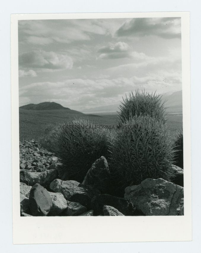 Photo cacti and rocks with desert in the background. Photo taken by Les Larson.