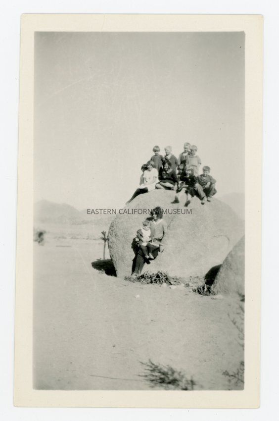 Photo of a bunch of children on a rock in the desert. Written on reverse: 7th Day Adventist home, Alabama Hills.