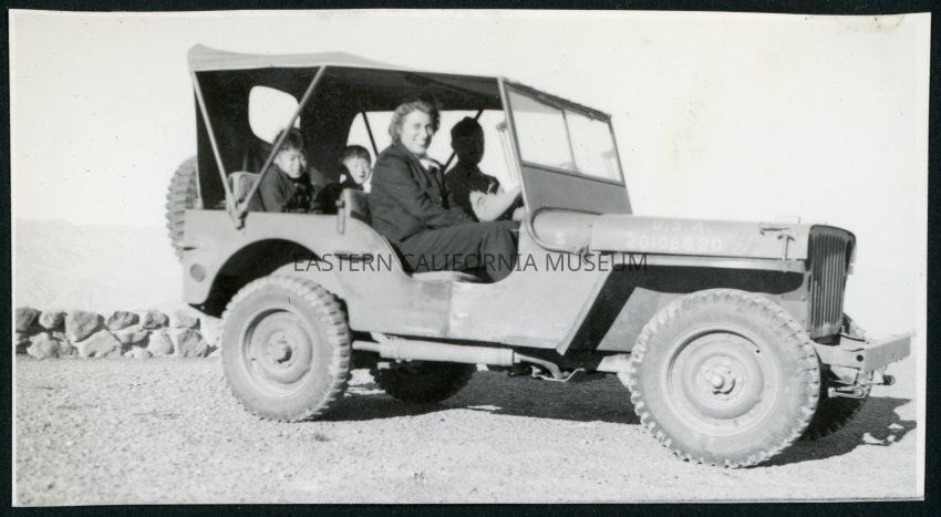 Photograph of L. Josephine Hawes and three others sitting in an Army jeep in Death Valley National Park. Incarcees were transferred to the former Civilian Conservation Camp after the Manzanar Riot for their own protection.