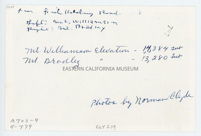 Information likely added by Elodie Drew on 04/09/1958: Mt. Williamson elevation--14,384 feet. Mt. Bradley [elevation]--13,280 feet. Photos by Norman Clyde.Collection