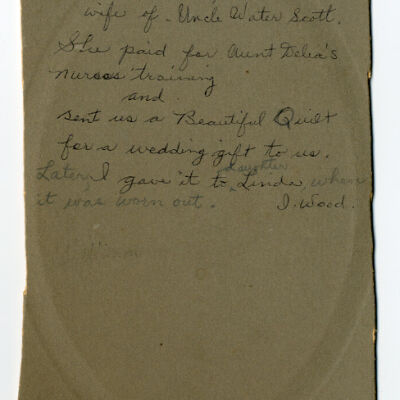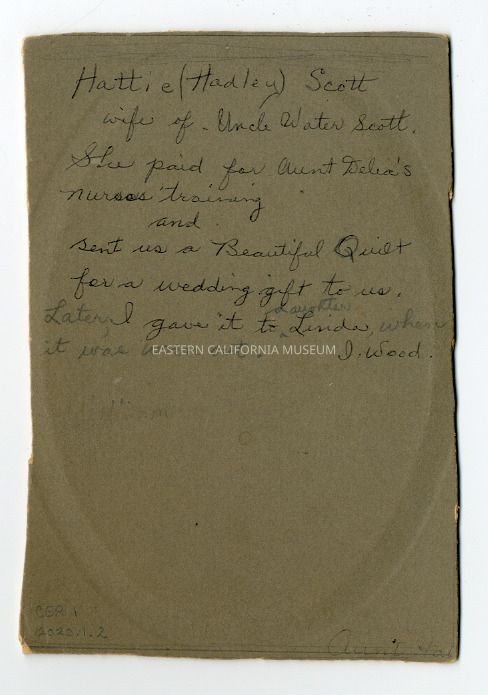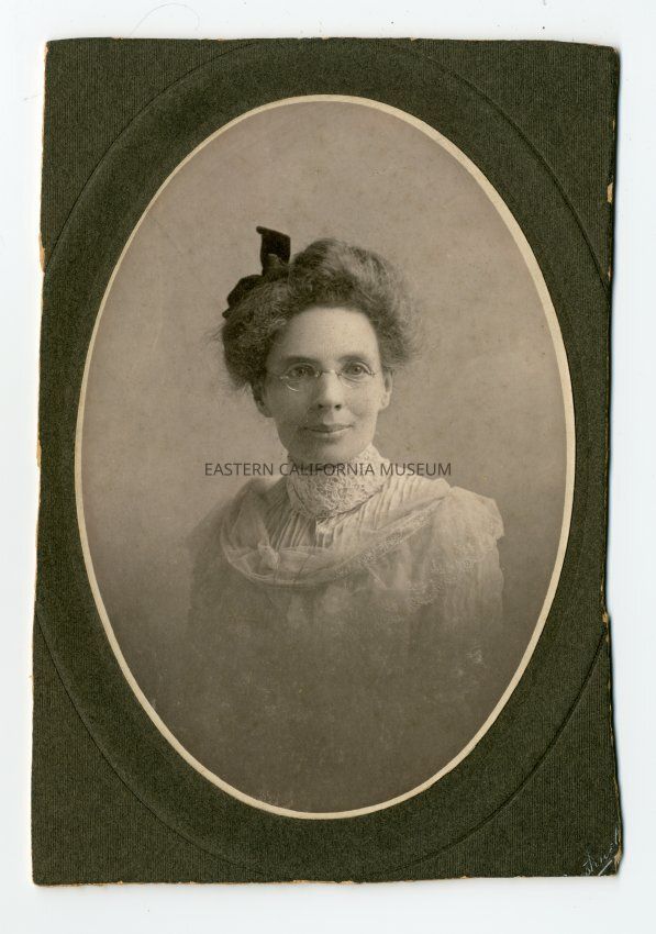 Mounted photograph of Hattie (Hadley) Scott, who was the telegraph operator at the Lone Pine Railroad Station (Mt. Whitney Station). She was married to Walter Scott (1853-1922), and it was said that they made money in the oil wells. In this photo she is wearing thin rimmed glasses, a black bow in her hair, and a high-necked white dress.
