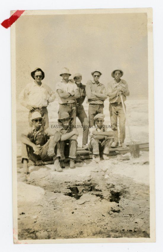 Photo of a group of eight men (five standing, three sitting) on the dry lakebed of the Owens Lake. They are likely LADWP employees constructing power lines.Collection