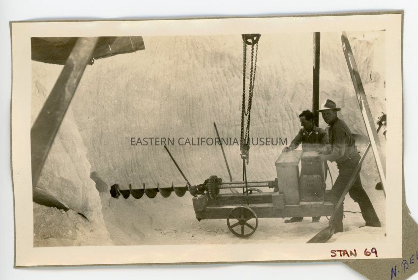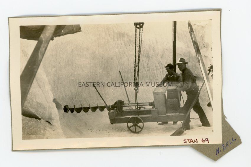 Photo of two men using a salt drill at the tramway. N. Bell is on the right.