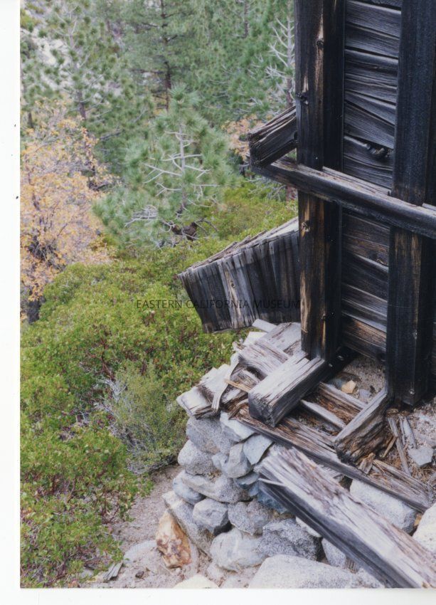 Color. Timber structure, possible a sluice (?), view down into Owens Valley from mountainside, evidence of the logging operation in the Sawmill Creek area.Collection