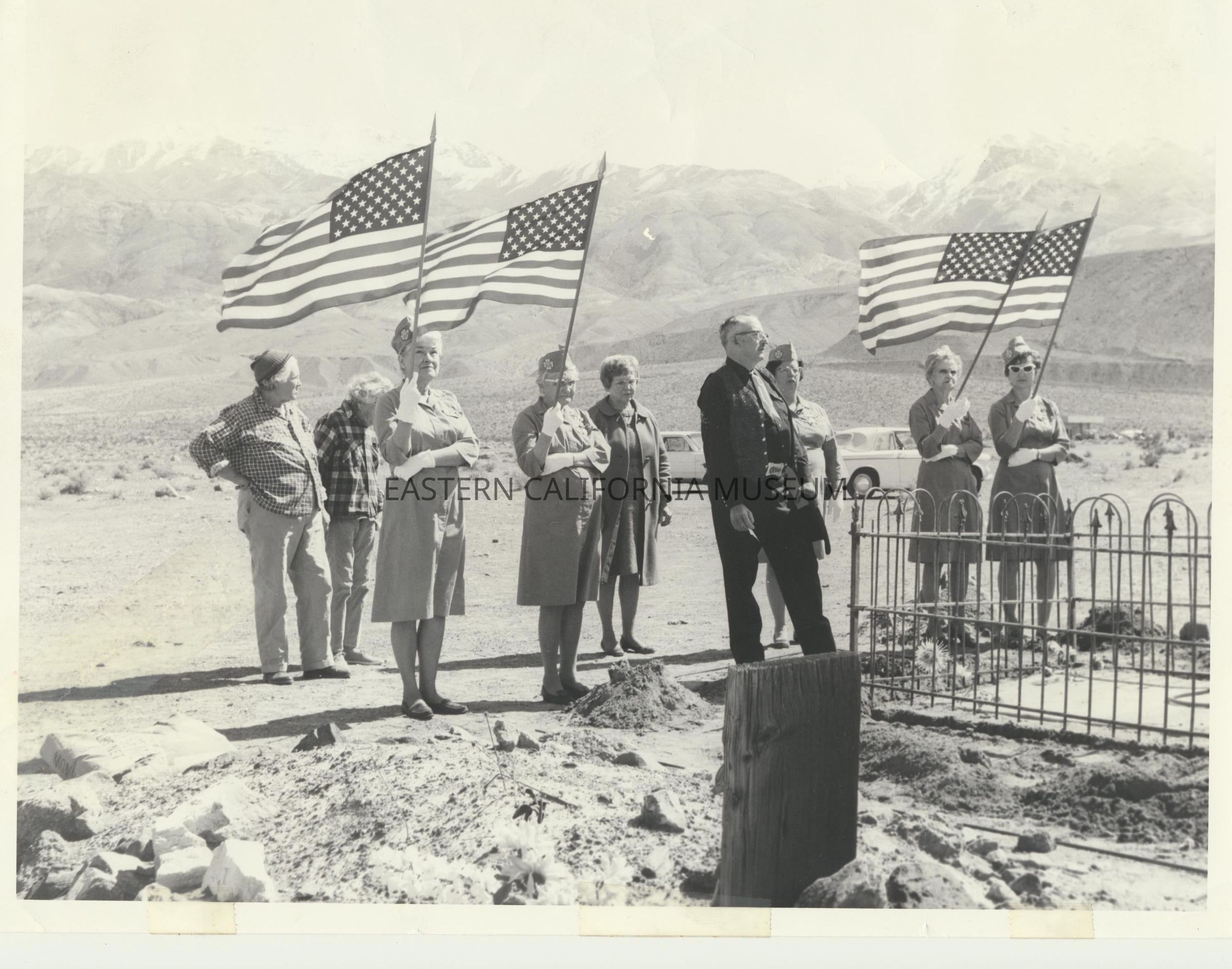 Photo of the plaque dedication to Charles Ferge, AKA Seldom Seen Slim, at Ballarat on March 15, 1969. Ladies from the Trona VFW Post were the color guard. George Pipkin recalled some tales of Slim. George Pipkin and Doris Bray are in the picture plus seven other people.