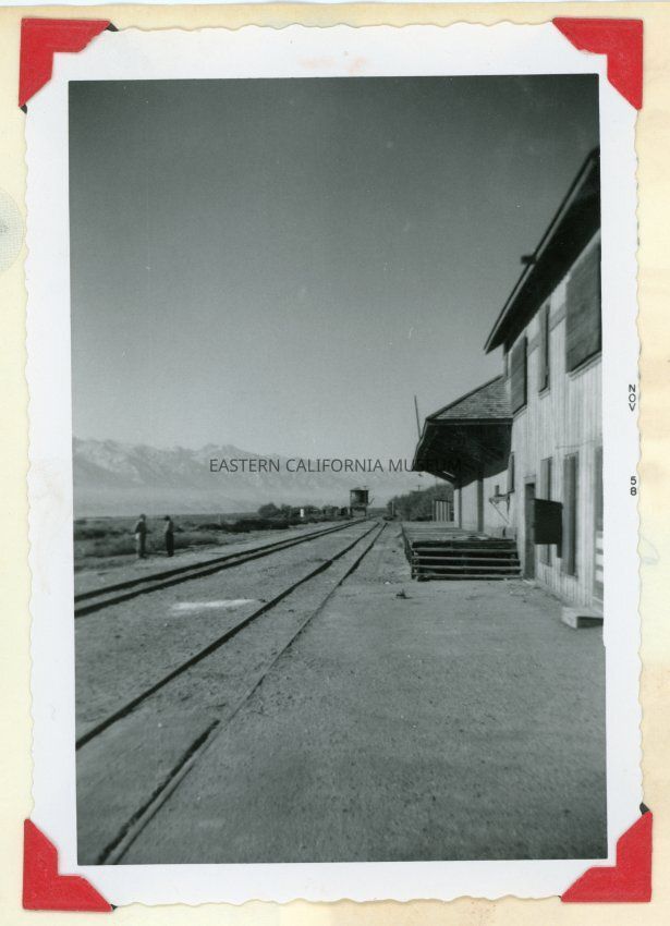 Photo taken looking northwest from the Keeler railroad station down the tracks toward a water tank. Photo taken in November or December 1958 by C. Krautter.
