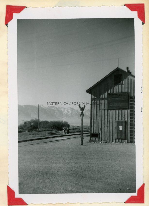 Photo of the Keeler railroad station in November or December 1958. There is a notice of railroad abandonment on the boarded up windows.