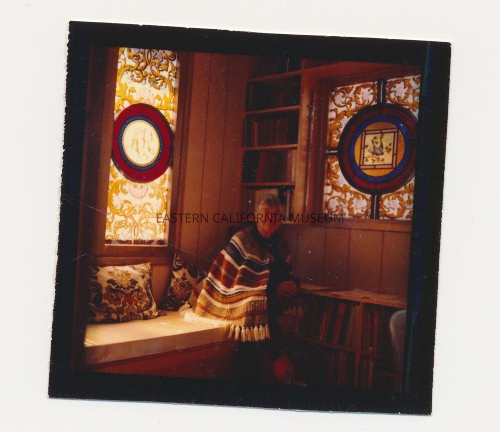 Color photo of author Evelyn Eaton sitting on a bench seat, possibly in the library of her home. She is wearing a wearing a striped poncho or cape.