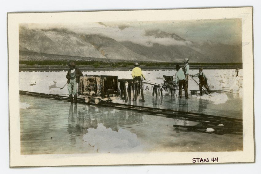 Tinted photo of a group of workers on the salt lake in Saline Valley. Photo taken looking northwest.Collection