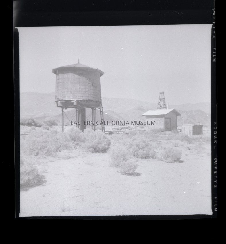 Photo of the water tank and pump house for the Southern Pacific narrow gauge railroad at Kearsarge station. Photo taken on 09/21/1958 by W. P. Payne.Made/Created