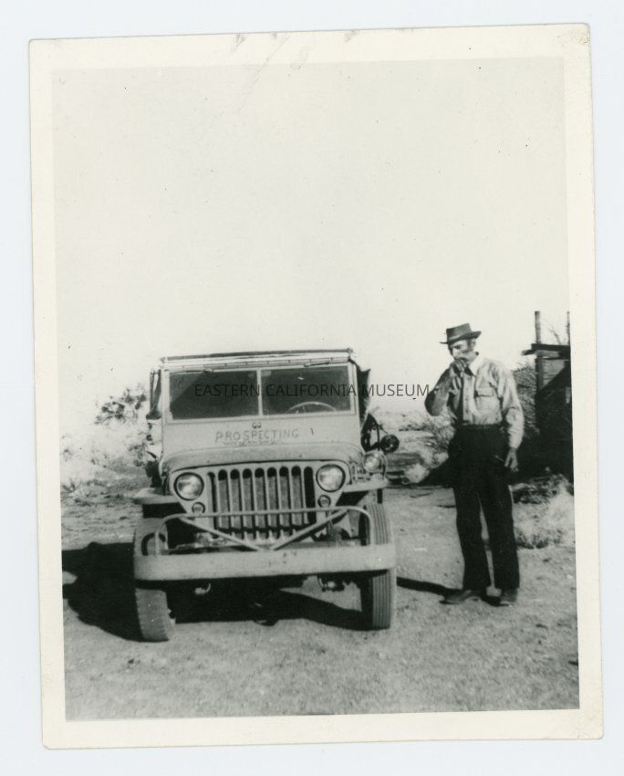 Photo of Charles Ferge, better known as Seldom Seen Slim, standing beside a jeep, which has "Go Prospecting with Seldom Seen Slim" written on it.Collection