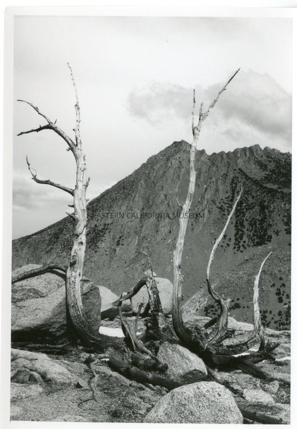 B&W glossy print: snag among rocks, on high ridge