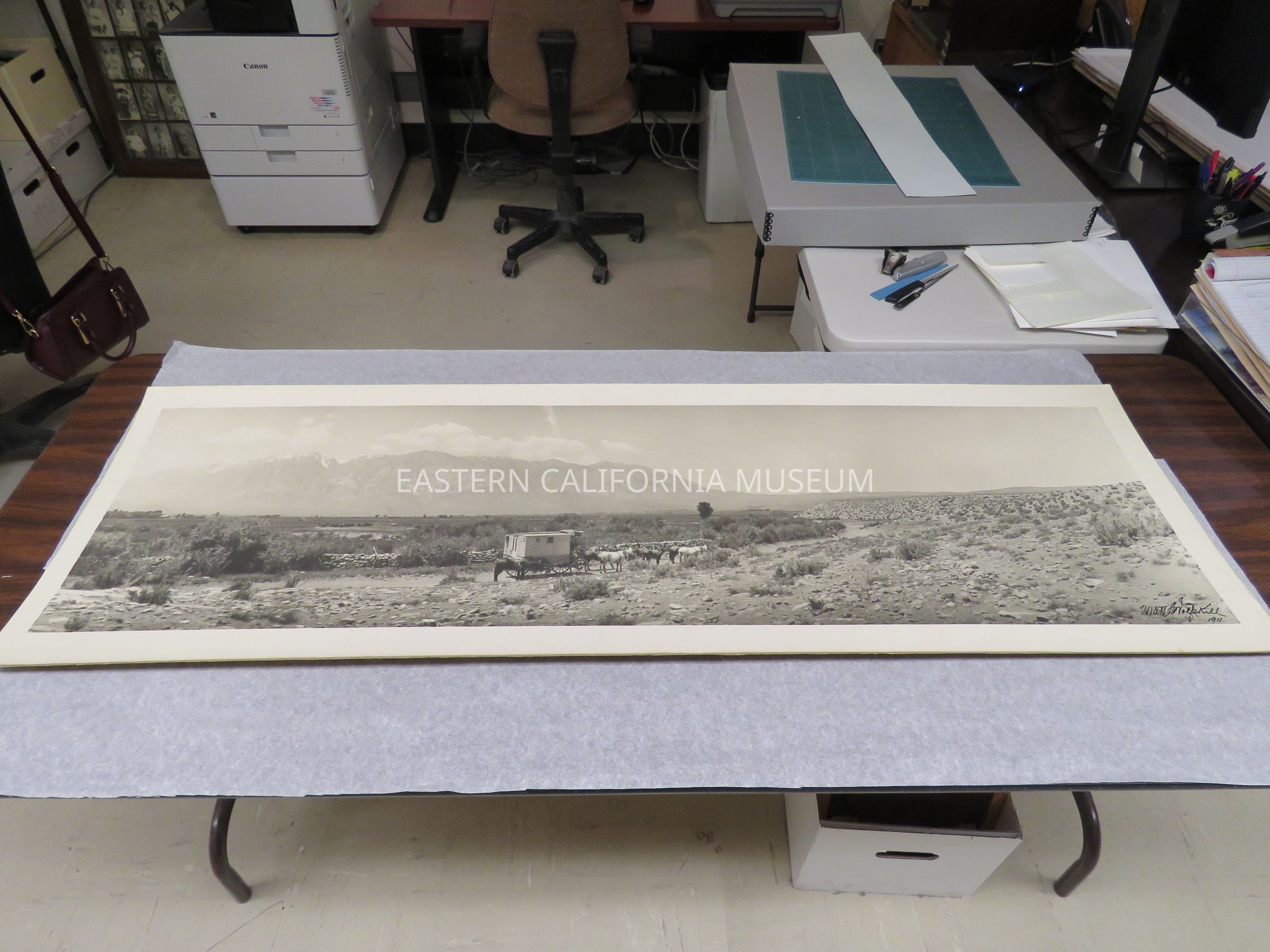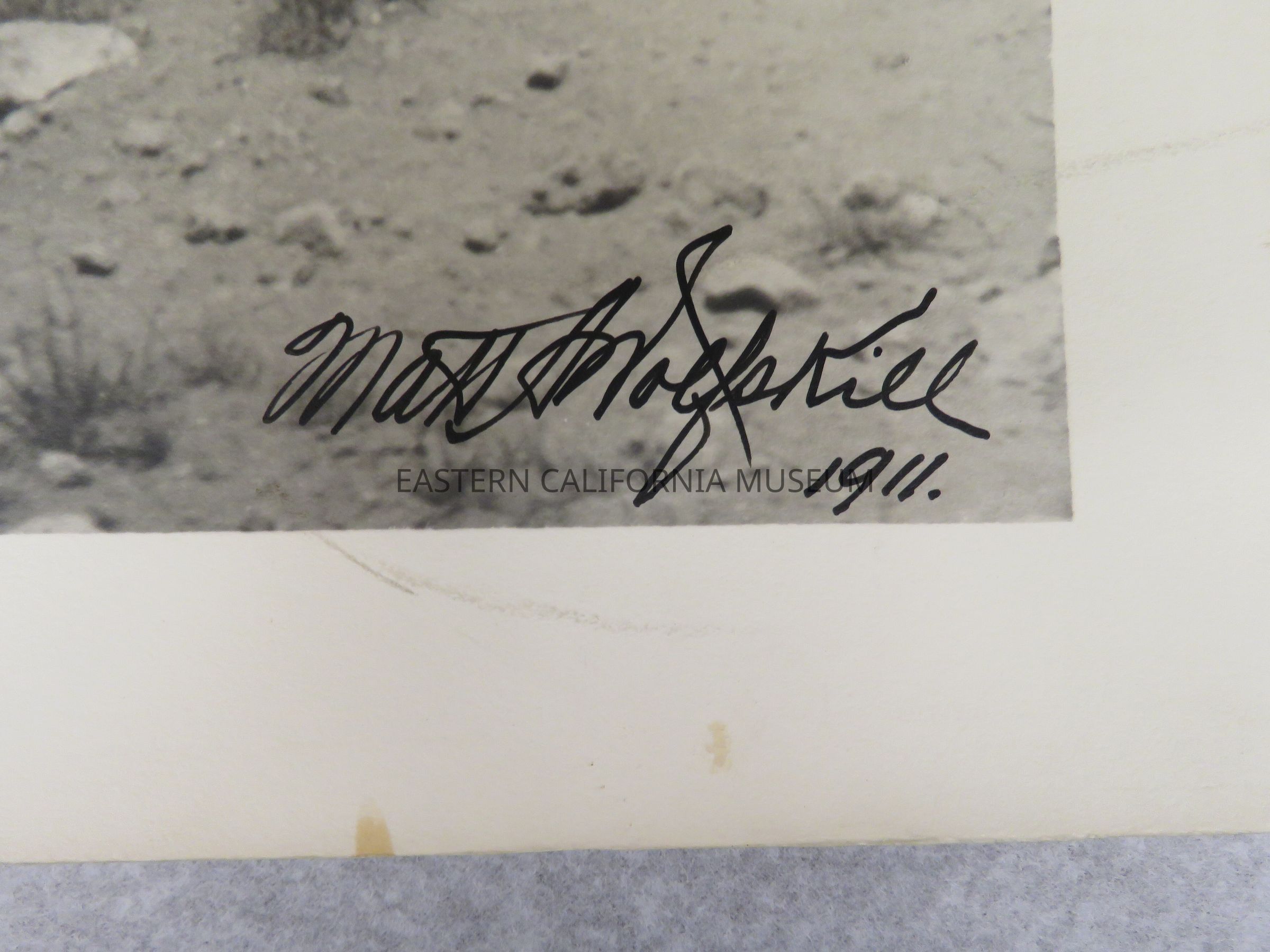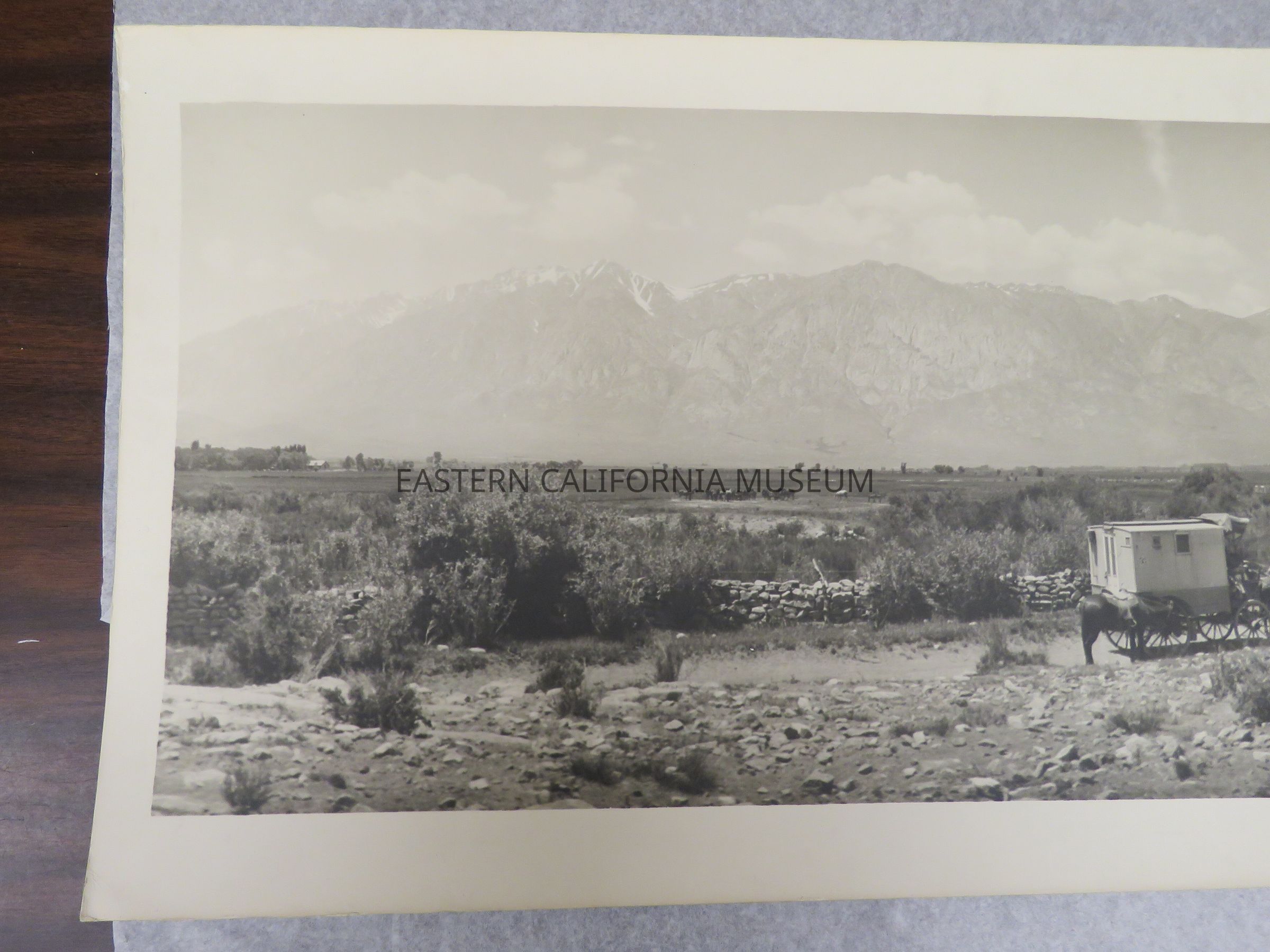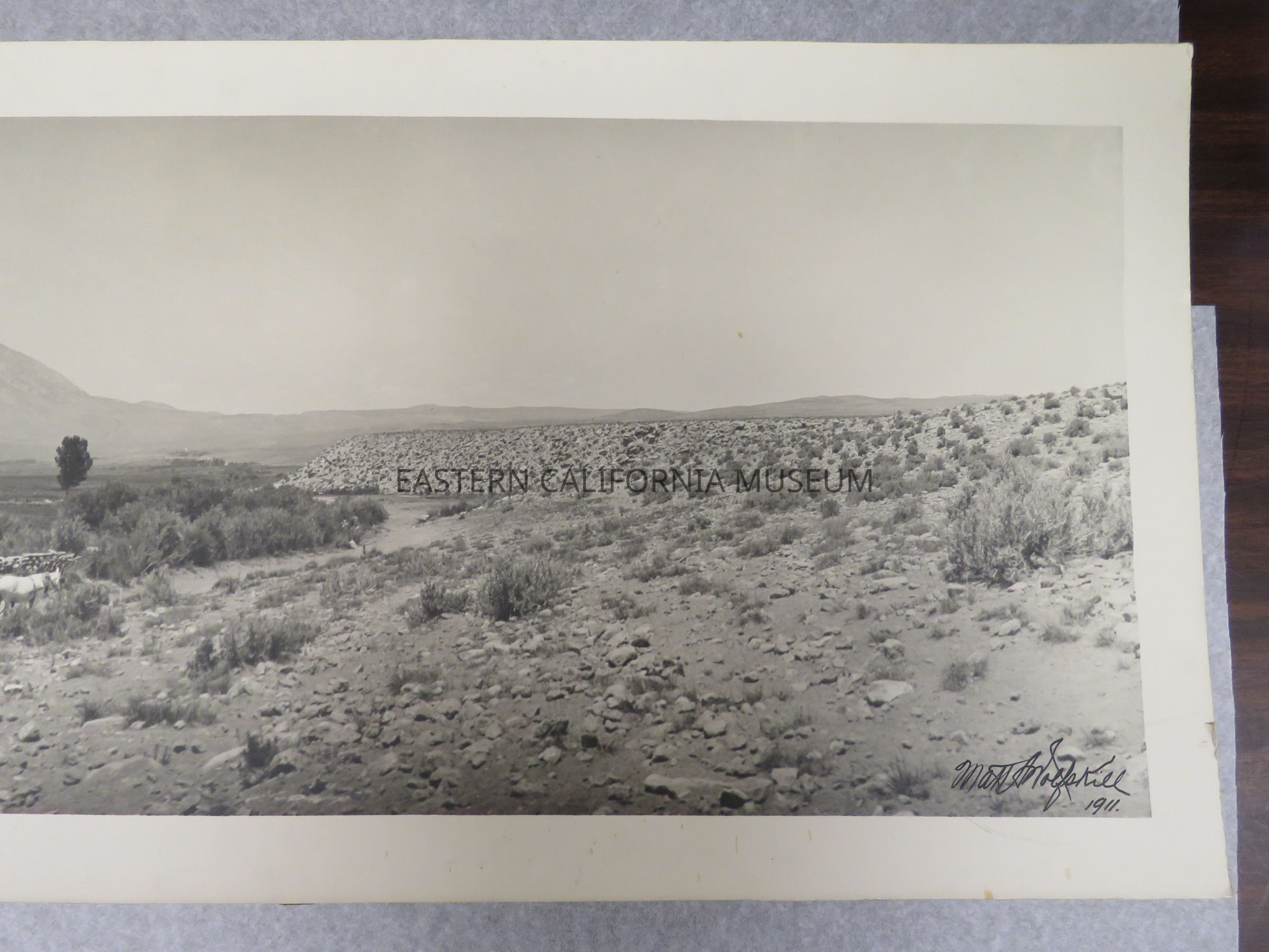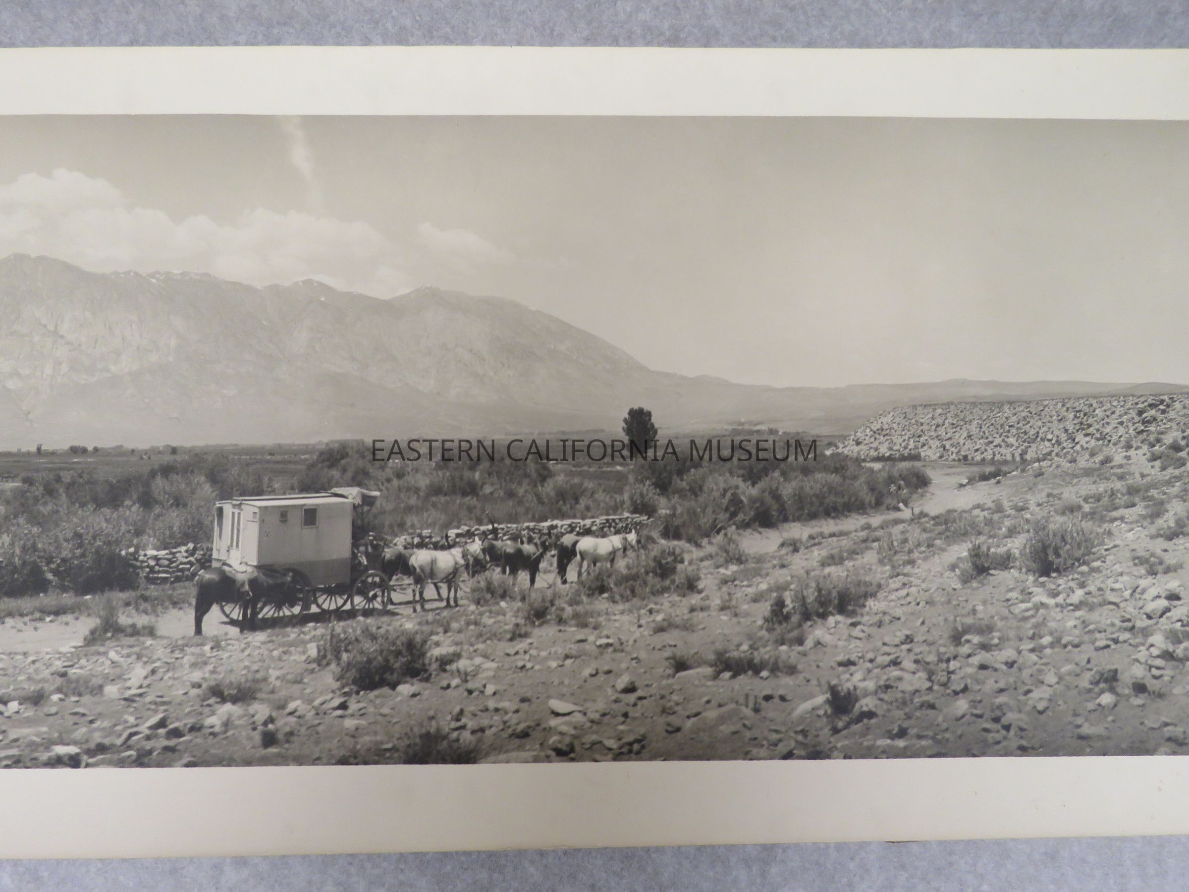 Photo of Matt Wolfskill's travelling darkroom wagon parked on a dirt road lined by a stone fence. There is a berm to the right, a herd of horses in the field, a house in the distance on the far left, and a mountain range in the background (Sierra Nevada?). Signed by Matt A. Wolfskill, 1911. Same photo as 1993.45.11.