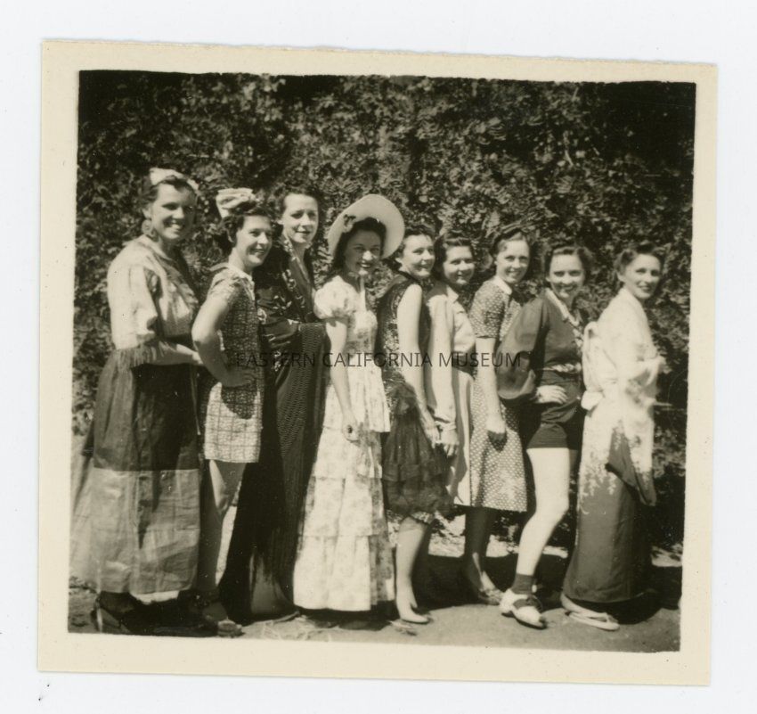 Small photo of a group of nine young women posing in a variety of costumes, possibly in Lone Pine.