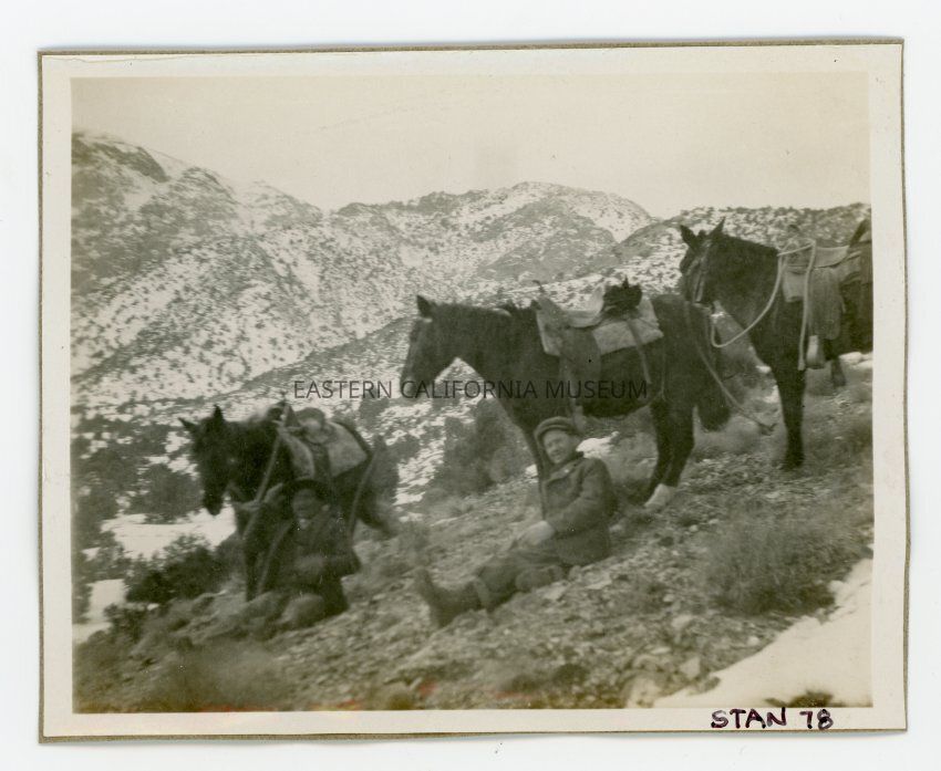 Photo of three horses and two riders sitting on a hillside in the Inyo Mountains. They are dressed warmly and there is snow in the background.