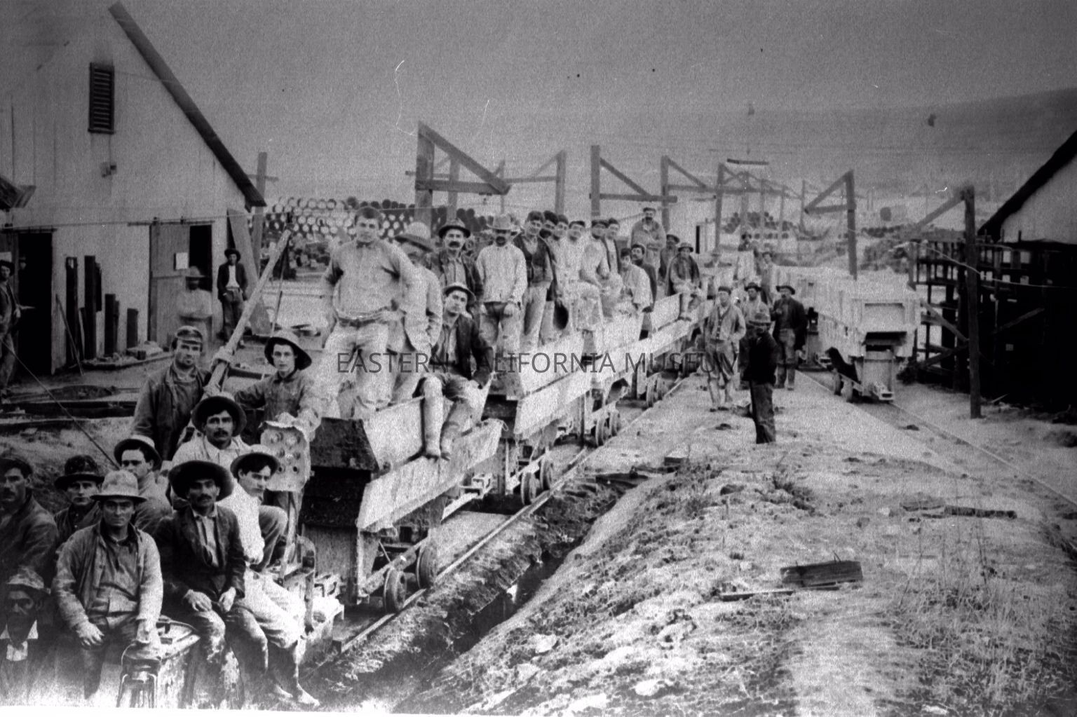 B & W digital scan of LADWP Laborers sitting in Rail Cars. Rail Cars may be associated with one of DWP's Limestone Quarries in the Monolith area east of Tehachapi or one of the Tunneling Projects on the LA Aqueduct.Collection