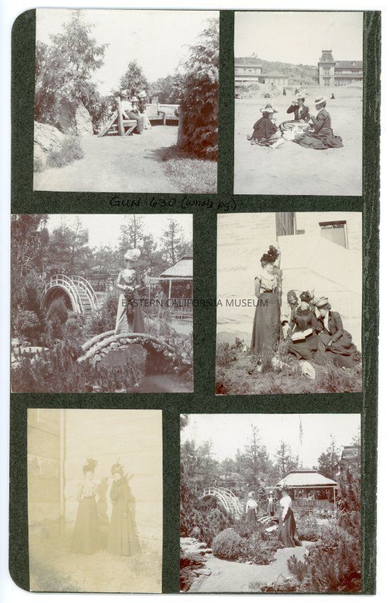 A1831.5.2f: Exterior photo of two women and a young girl (likely Helen Gunn) standing in what looks like the Japanese Tea Garden at Gold Gate Park in San Francisco. Arched bridge (drum bridge?) in background. Same photo as A1831.1.26e.Collection