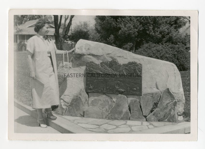 Photo of a woman standing next to a stone monument with a plaque that says, "Dedicated to the pioneers of Inyo County."