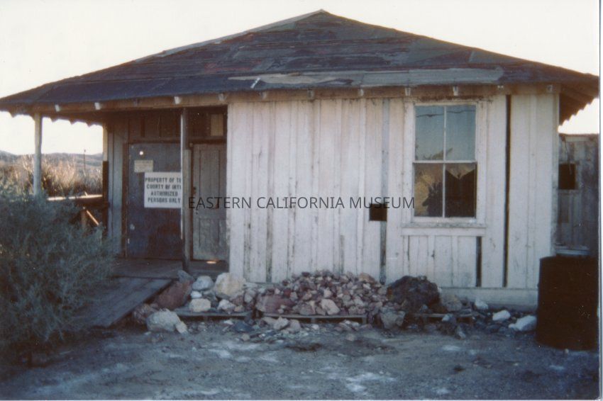 Color glossy print: building, appears abandoned with Inyo Co. sign on the door