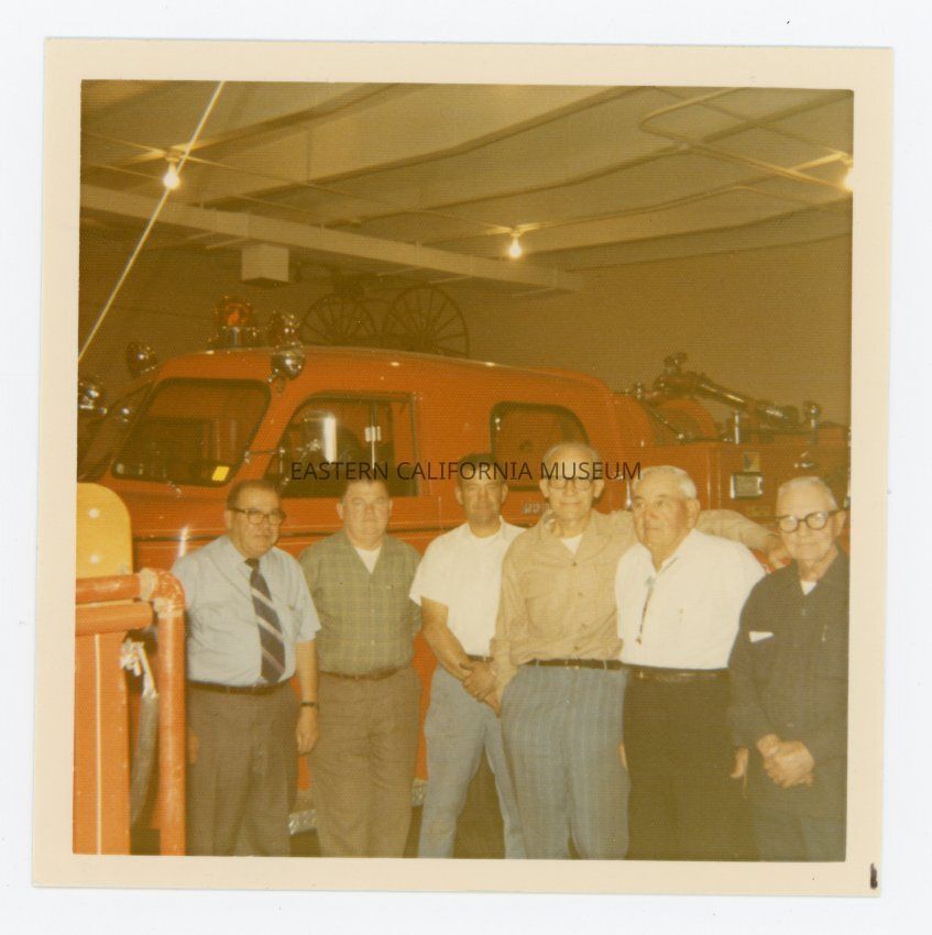 Color photo of a group of six men standing in front of a fire truck or engine.