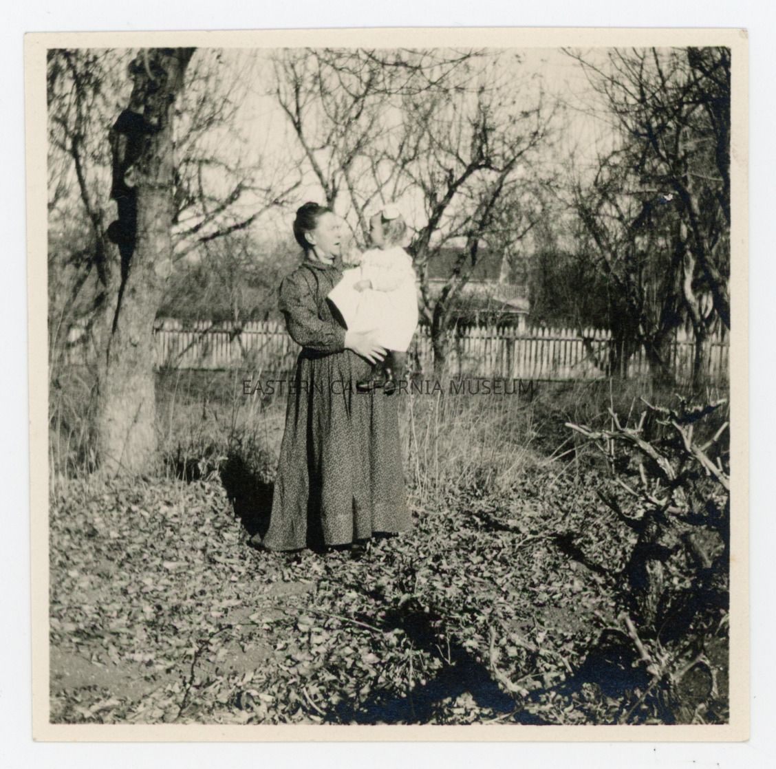 Exterior photo of woman holding a little girl. There are lots of dead leaves on the ground, so likley taken in the fall or winter. There is a white picket fence in the background.