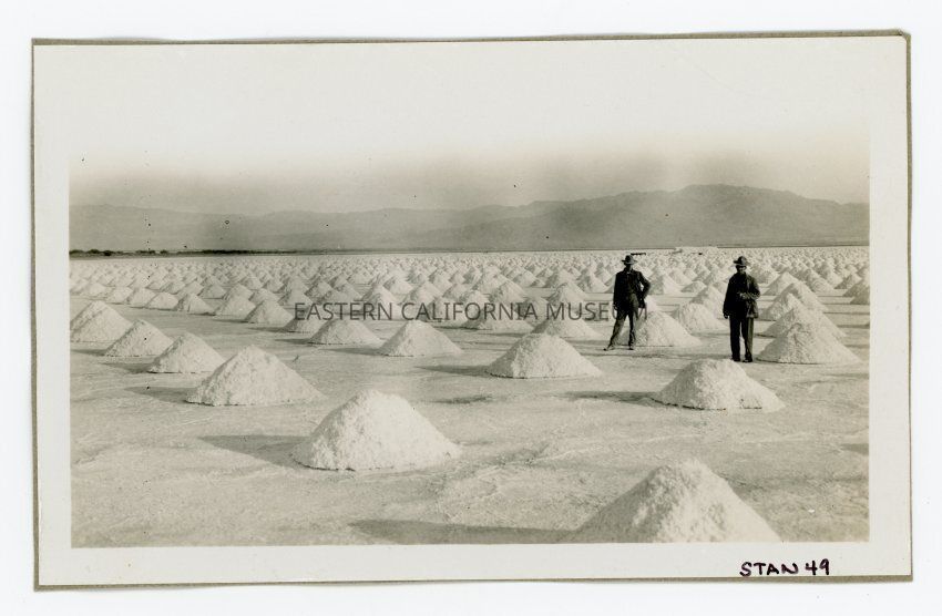 Photo of two men standing amidst piles of salt on the salt lake in Saline Valley. Photo taken looking north with the Saline mountain range in the background.Collection