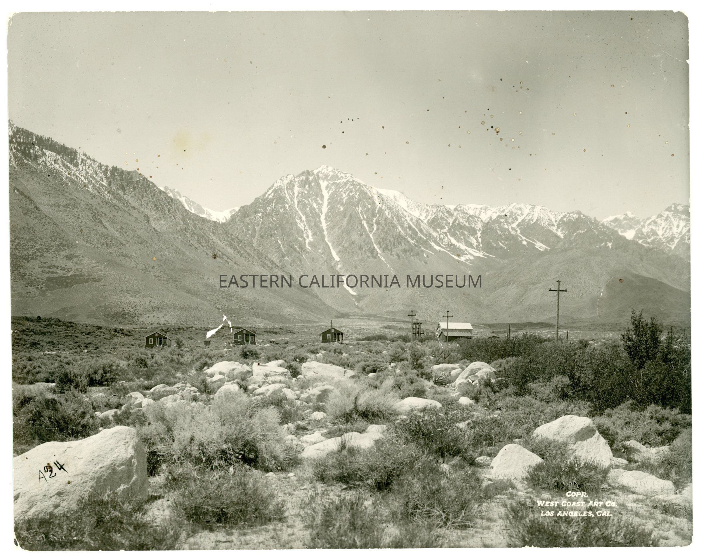 Photo of Division Creek Power Plant showing both Units # 1 (white roof) and #2 (brown roof). The three dark structures to the left are housing for LADWP employees. Photo taken looking west to Sierra Nevada mountain range. Photo was taken by West Coast Art Co. of Los Angeles, CA. and given their ID #A24.