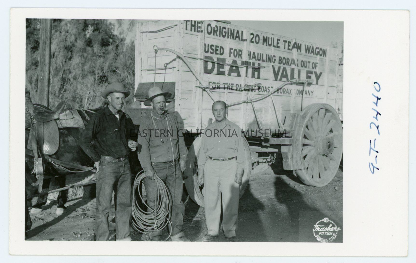 Photo postcard of three men standing in front of an original Borax wagon. Photo taken by Burton Frasher and given his ID #9-T-2440.Collection