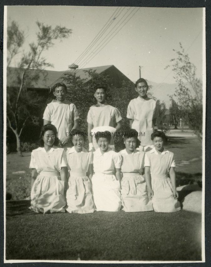 Photograph of eight hospital staff posing on the grass in front of the Manzanar hospital. The five women are kneeling in the front row and the three men are standing behind them. In the background, landscaping and buildings are visible.Collection
