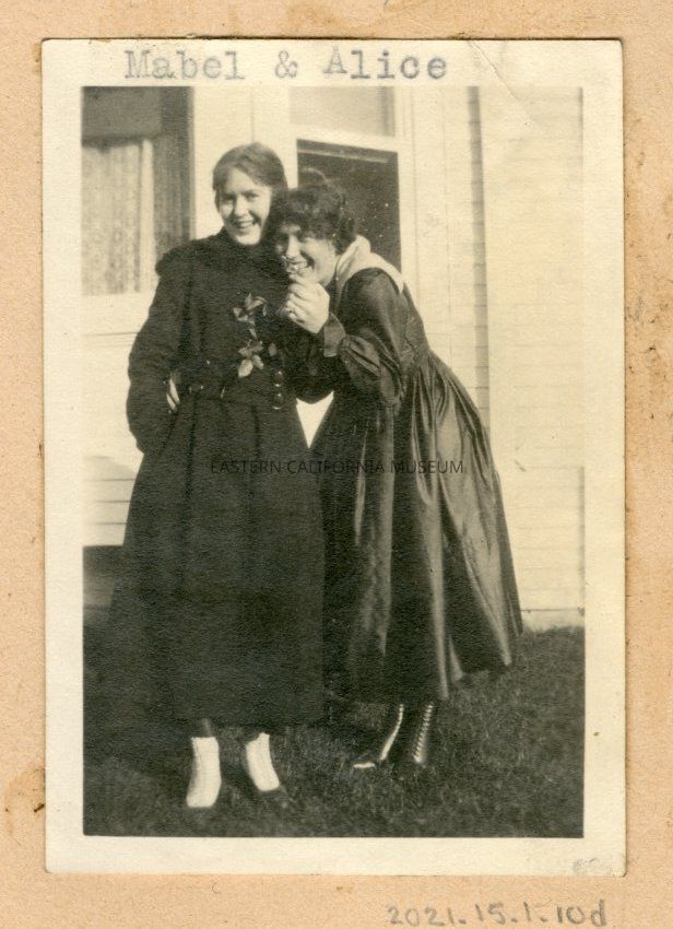 Photo of two young girls laughing together in front of a house. They are identified as Mabel and Alice. It appears to be the same location as 2021.15.1.10e.Collection