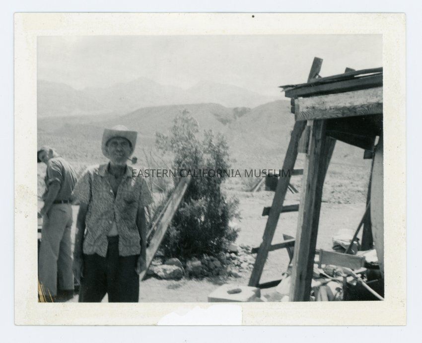 Photo of Charles Ferge, better known as Seldom Seen Slim, standing beside a wooden structure. There is a man behind him. This may be at his cabin in Ballarat.Collection