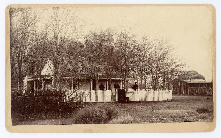 Another copy of the same photo has, "Birthplace of Mark B. Lacey, Fort Independence" written on the reverse with a little map of the location of the house.Collection