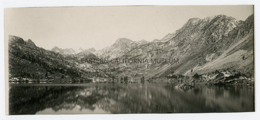 Photo of a Lake Sabrina with the Sierra Nevada mountains rising behind it. Written in pencil on reverse: Lake Sabrina. Written in blue ink on reverse: Scott.