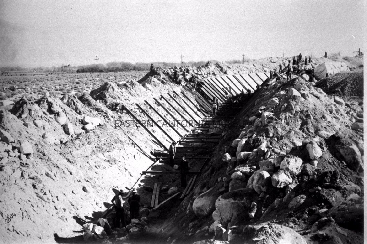 B & W digital scan of LA Aqueduct Concrete Lining Crew forming up "The Ditch" for "The Pour" on the Open, Lined Section of the Aqueduct, location; west of Lone Pine. Note boulders excavated.Collection