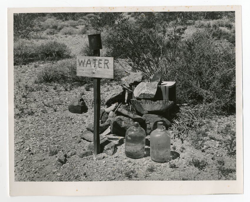 Label on reverse: Two of the bottles of water Adrian Egbert placed along the grade up the Avawatz Mountains to Cave Spring for drivers whose cars were boiling.