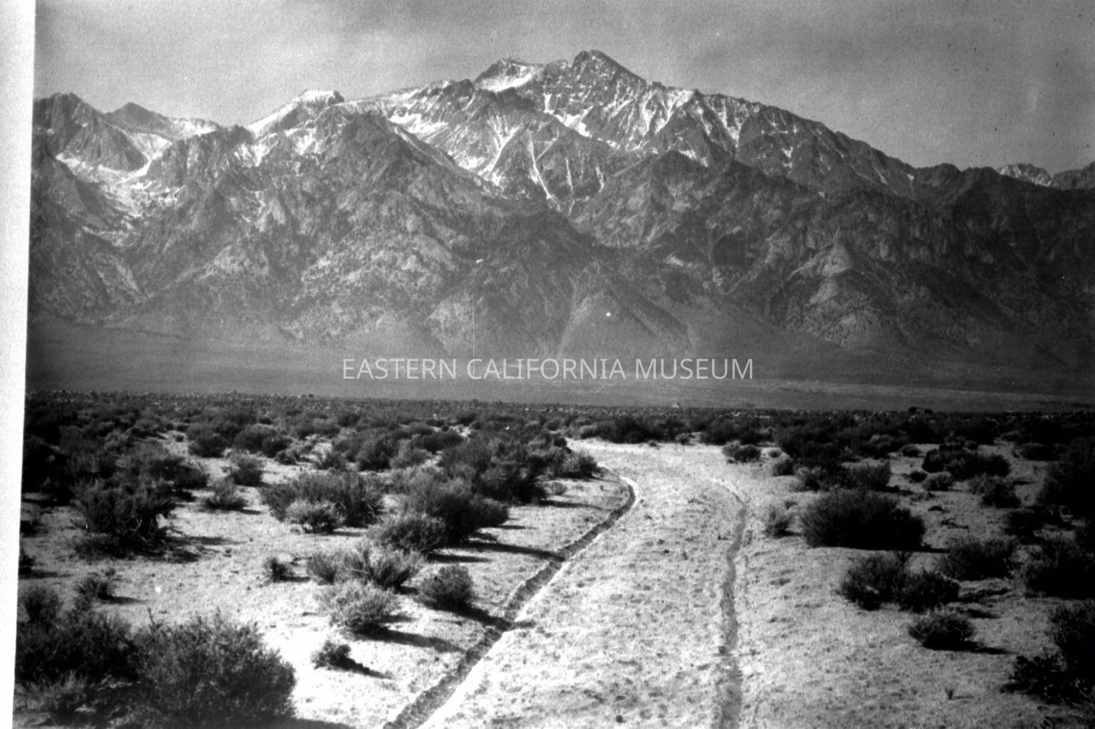 B & W digital scan of Mt Williamson along High Sierra Crest. Looking from east to west. Image taken south of Manzanar shows North and South Fork of Bairs Creek Canyons as well as George Creek Canyon.Collection