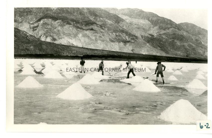 B/w photo of four men in foreground shoveling salt, large piles of salt, and three more people and mountains in the background.