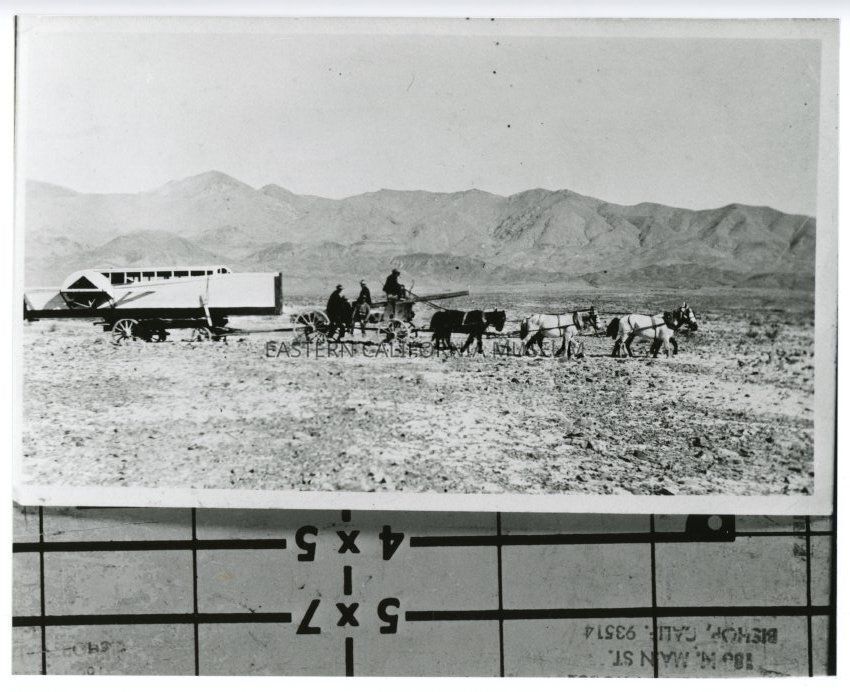 Copy of a photo of a team of six horses hauling an unusual looking boat to Owens Lake. There are four men sitting on the wagon, and one of these men is likely the boat's owner, George Larry.Collection