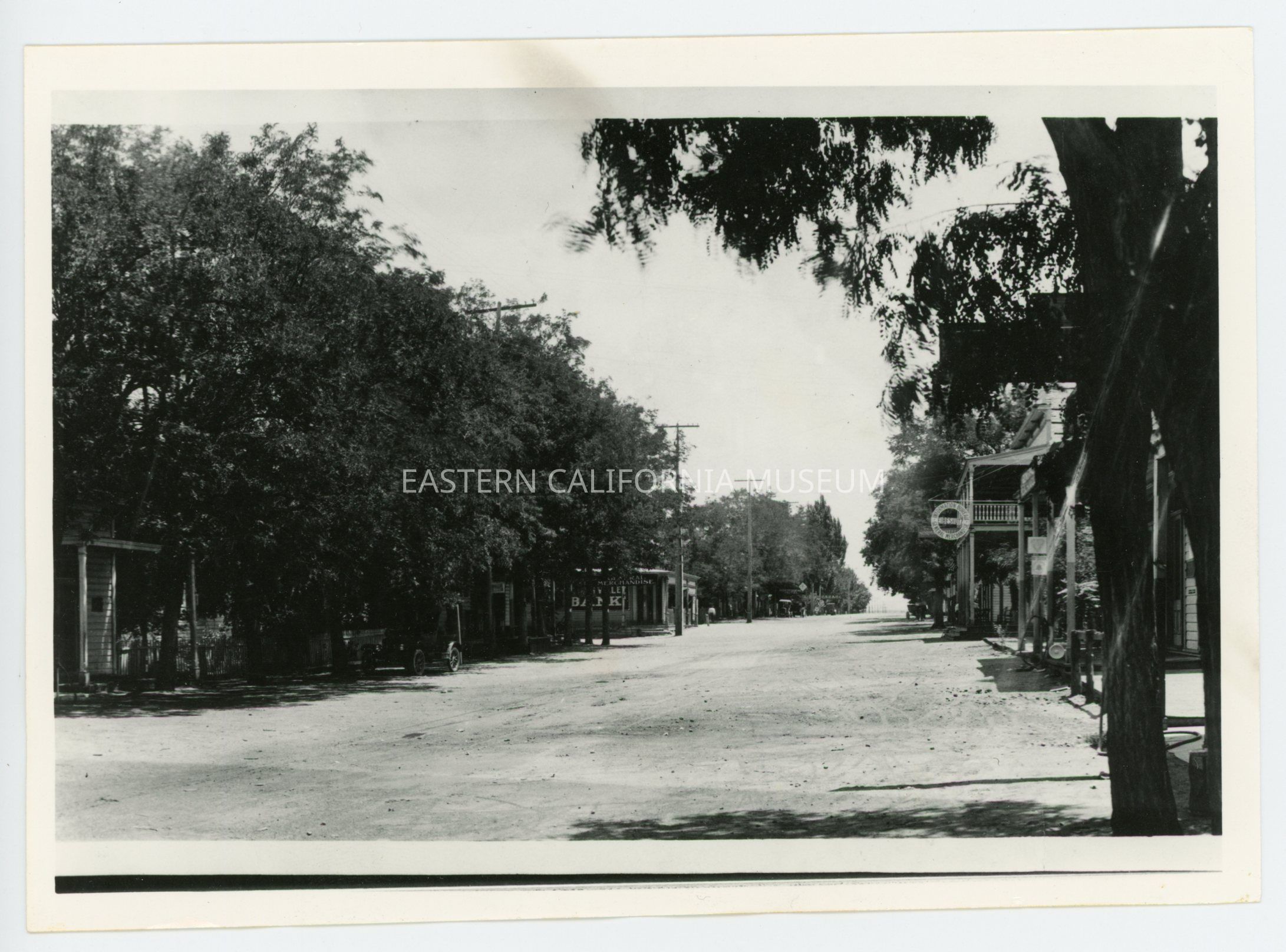 Copy of a photo of Edwards Street in Independence. There are several buildings and businesses visible. The road is dirt, and there are many tall trees lining both sides of the street. On the right is a sign for Eibeshutz Information Bureau and General Merchandise (a two story building), and on the left are signs for a bank and general merchandise. There is an early vehicle parked on the left side.Photograph Details