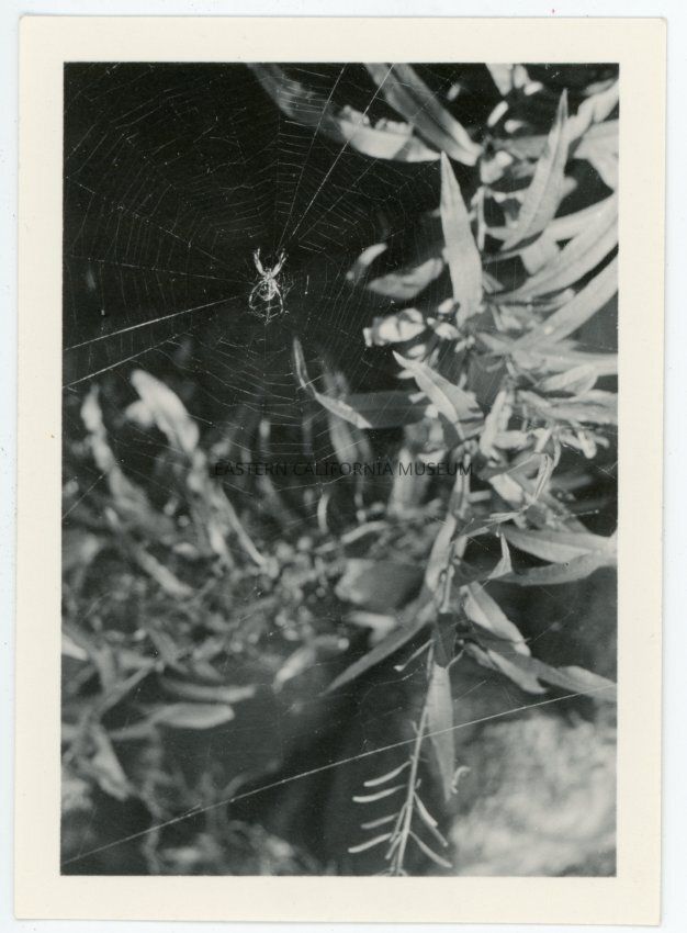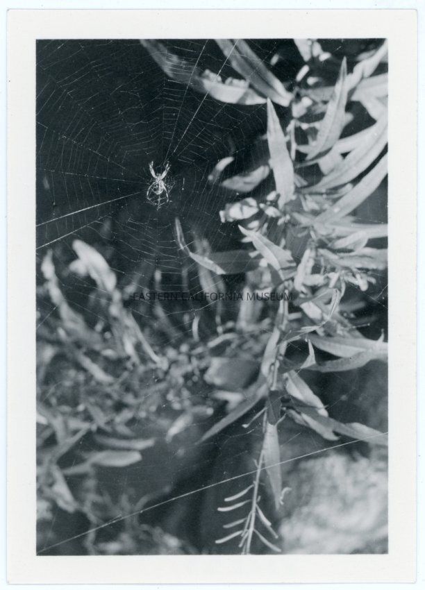 Photograph of an orb spider on its web with vegetation in the background From the envelope: "Lizard; Spider"
