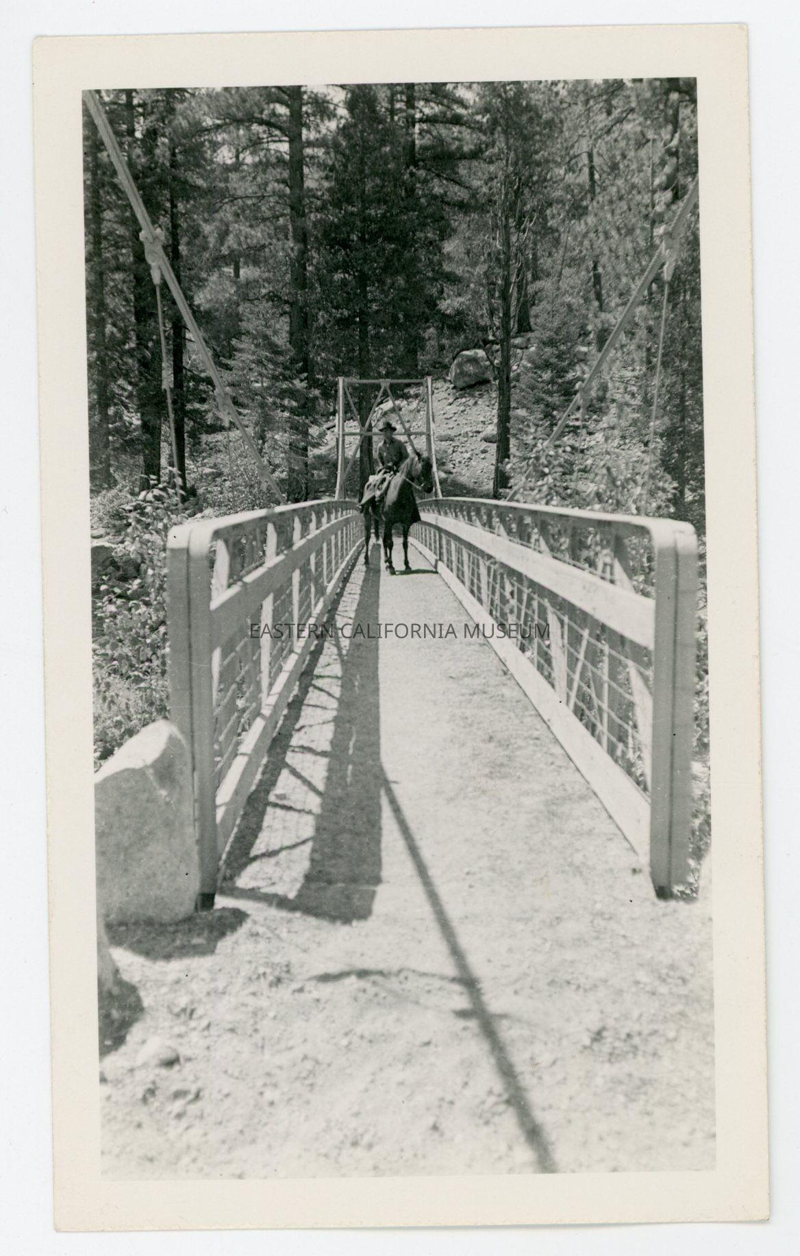 Photo of a man on horseback crossing a bridge. Written in ink on reverse: Kern River Bridge at Lewis Camp, 1935.