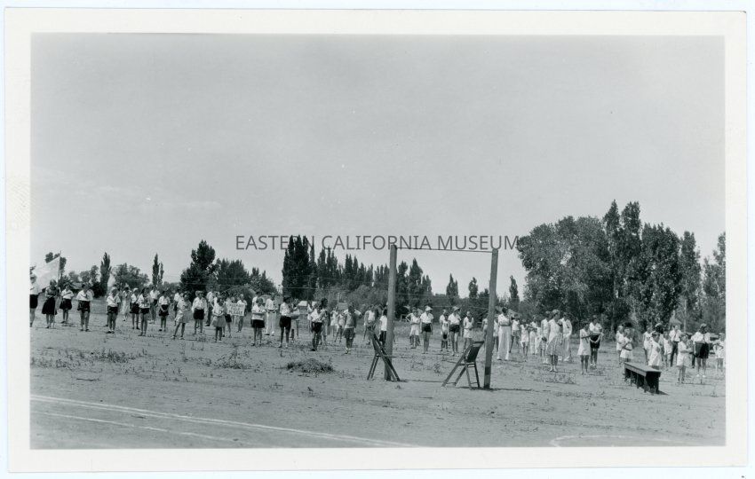 Photograph of a school event in Big Pine, CA, rows of children and adults are lined up on a field.