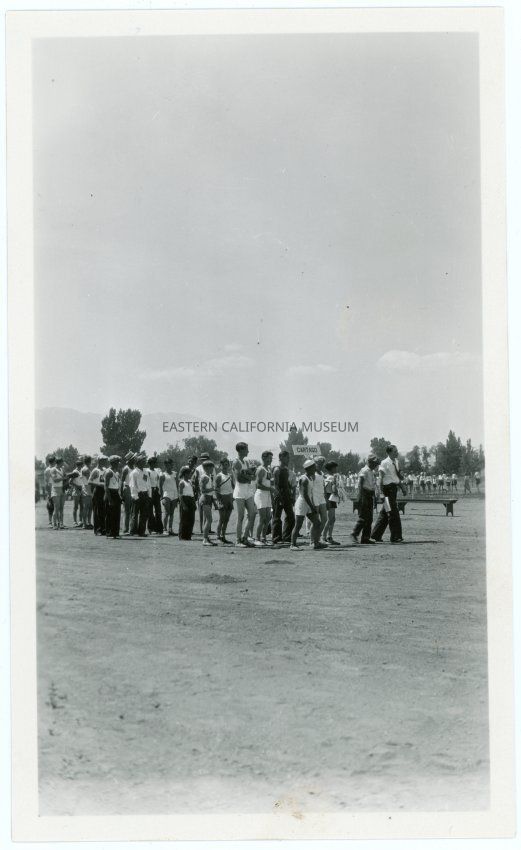 Photograph of a track and field event in Big Pine, CA, the image shows a group of boys with their coach (?). A sign reads Cartago behind them.