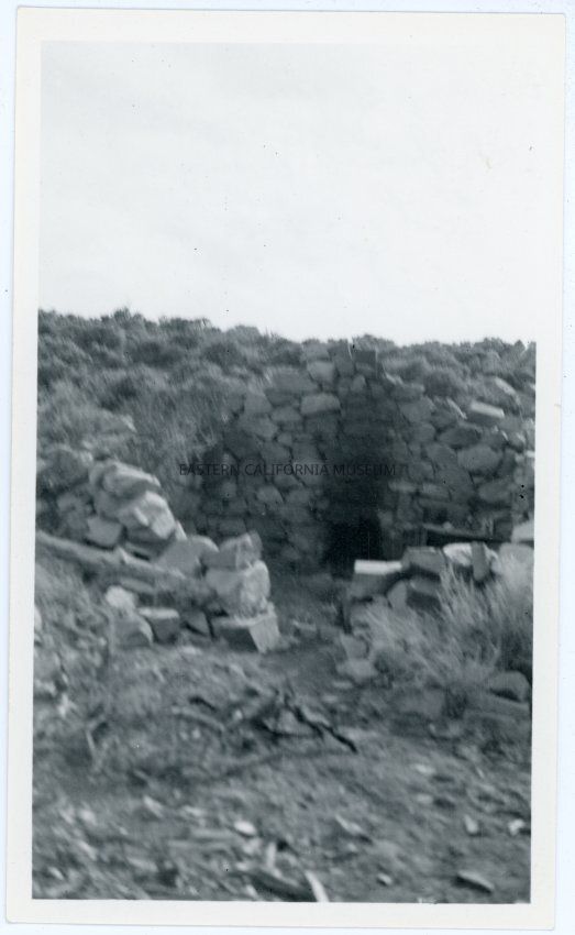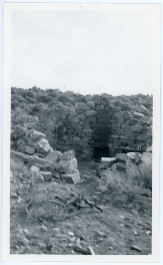 From the back of the photograph: "Remains of a stone cabin at Spanish Springs, east of Dod Springs, April 1937"