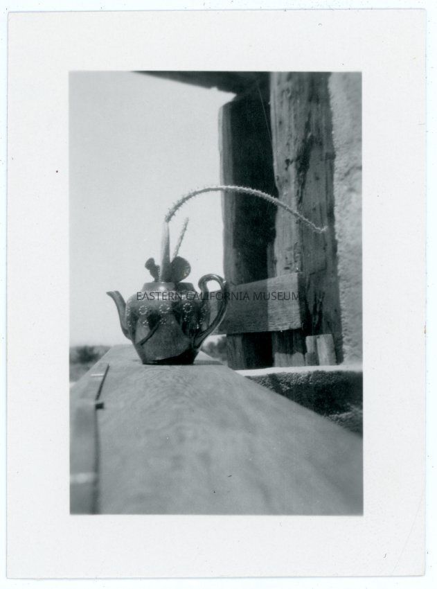 Photo of a cactus growing in a tea or coffee pot outside a rustic looking building. From the envelope: "Unidentified Photo"