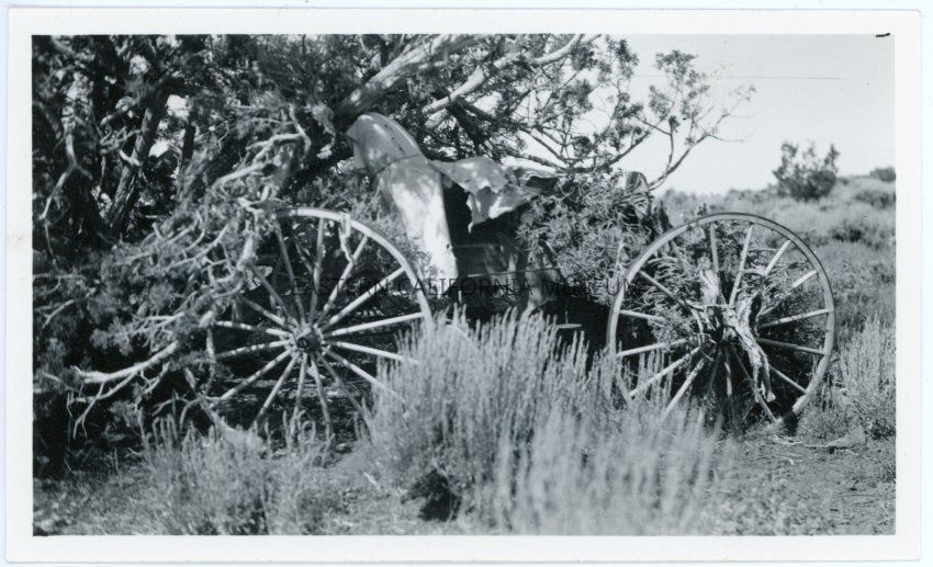 Photo of an old abandoned wagon parked beneath an overgrown tree or bush. From the envelope: "Unidentified Photo"