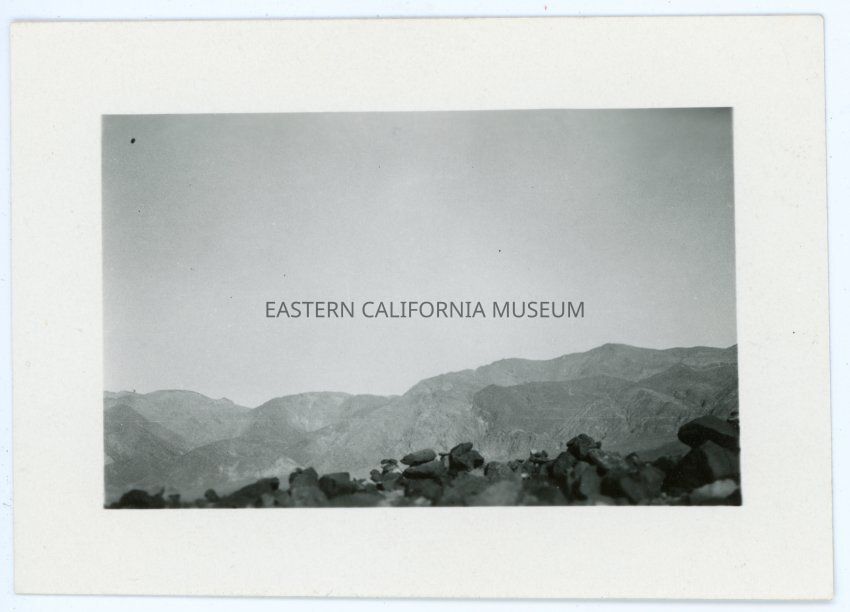Photo of a desert landscape with mountains. Lots of dark stones (lava?) in foreground. From the envelope: "Unidentified Photo"