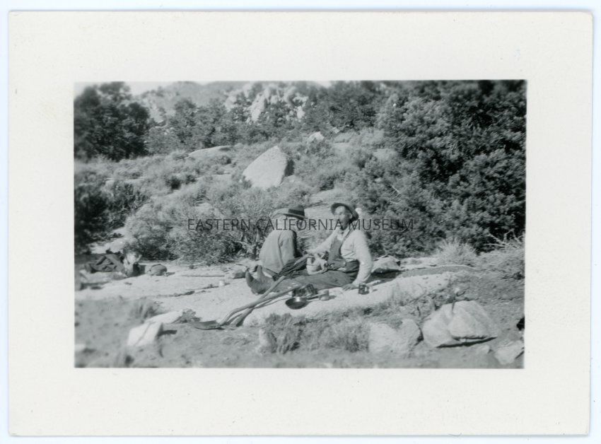 Photo of two men sitting either on a blanket or sandy area taking a break or having lunch. There are two shovels in front of them.