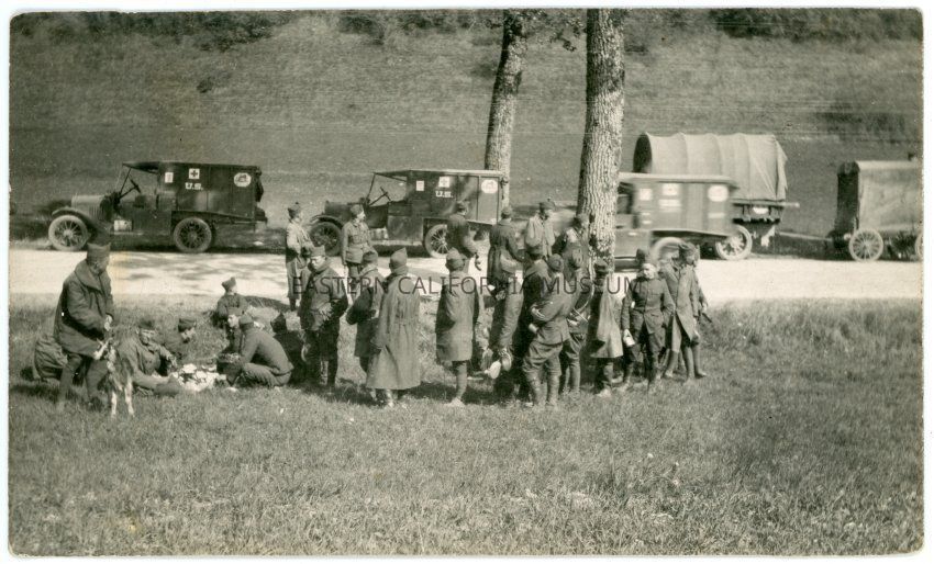 From the back of the postcard: "Convoy halt for lunch on the road to Bar de Due" From the envelope: "France & Germany; WWI"