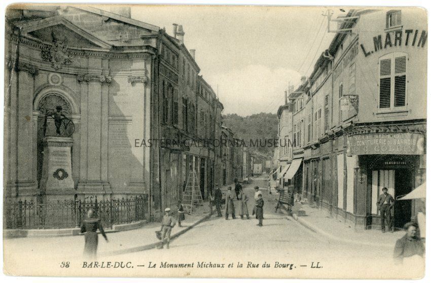 From the front of the postcard: "38 Bar-le-Duc. - Le Monument Michaux et la Rue du Bourg. -L.L." From the envelope: "France & Germany; WWI"